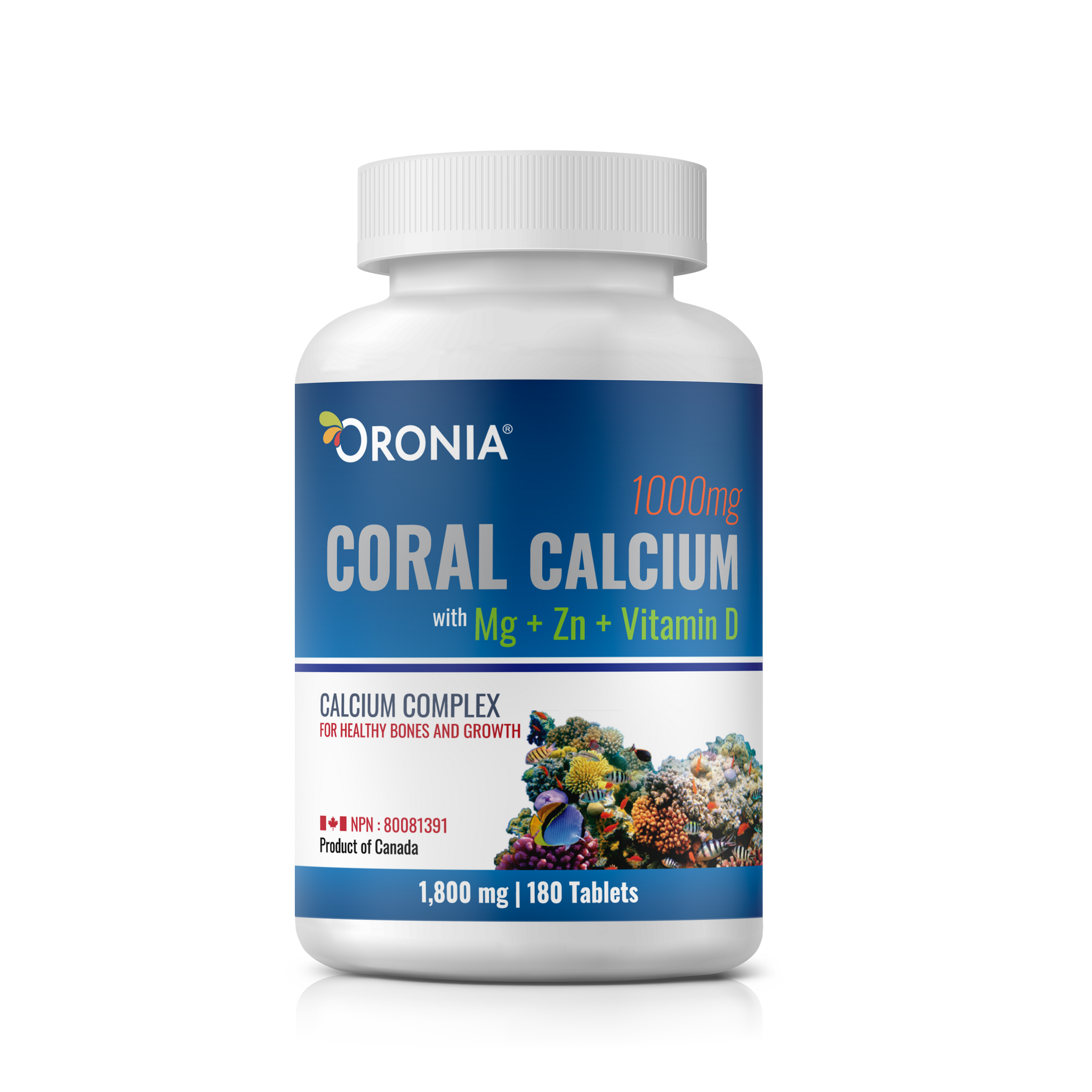 Oronia Coral Calcium fournit un complexe minéral unique d'origine naturelle, conçu pour favoriser des os solides, une fonction musculaire saine et une réponse immunitaire optimale. Notre formule combine 706 mg de calcium corallien pur avec des cofacteurs essentiels, dont le magnésium (130 mg), le zinc (130 mg) et la vitamine D ( 3.8 µg) - pour améliorer l'absorption et maximiser la biodisponibilité.